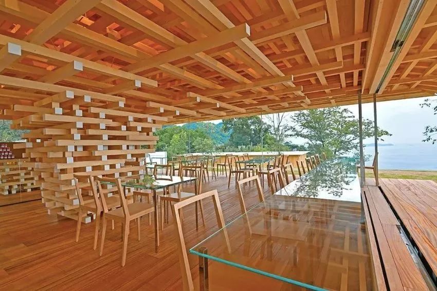 如同一颗大树的主干散出无数的分枝,隈研吾将日本柏树的木条搭起了日本静冈这个迷人的海边咖啡厅。