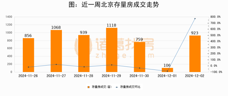 从存量房来看,2024年12月02日北京存量房单日成交923套,比昨日增加817套,环比上涨770.8%。从近一周存量房成交来看,北京存量房日均成交套数为824套,12月02日单日成交923套,高于近一周平均水平12%。