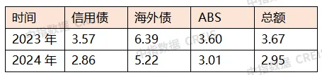 需要关注到,受连续降息、融资企业结构和产品结构变化等因素影响,行业债券平均融资成本明显下降。据中指研究院数据显示,2024年,房地产行业债券平均利率为2.95%,同比下降0.72个百分点。其中信用债平均利率为2.86%,同比下降0.71个百分点;海外债平均利率为5.22%,同比下降1.17个百分点;ABS平均利率为3.01%,同比下降0.59个百分点。