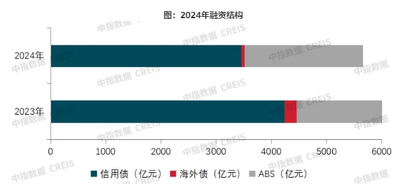 2024年,房地产市场整体仍呈现调整态势。虽然房企融资支持政策持续宽松,融资工具更加丰富,但是债券融资规模延续下降态势。其中,信用债是融资主力,ABS(资产证券化)发行占比提升,海外债在低水平基础上继续下降,而且期限偏短,房企难以从境外获得长期资金支持。
