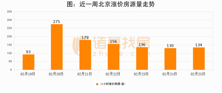 根据诸葛找房数据显示,北京24小时涨价房源量为134套,较02月24日增加4套,环比上涨3.1%。与此同时,涨价房源占比小幅扩大,业主信心有所提升。