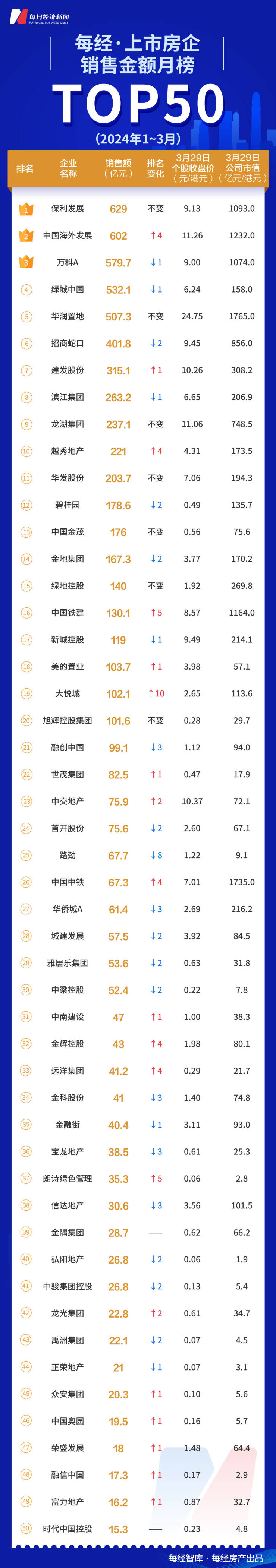 2024年一季度,上市房企TOP50合计销售额达到6975亿元,3月份单月销售额比2月份翻倍。三甲保利发展、中海地产、万科分别累计销售额629亿元、602亿元、579.7亿元。
