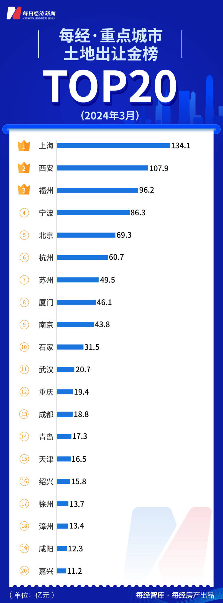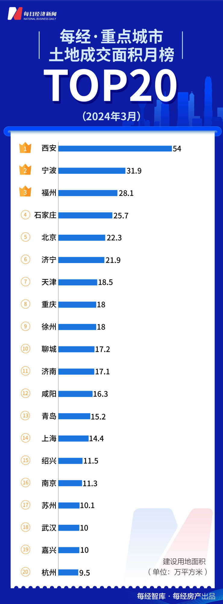 从TOP20城市分布来看,西安成交面积规模最大,但仅54万平方米,相当于2月份第11名的水平。