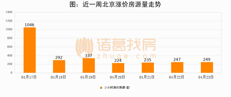 根据诸葛找房数据显示,北京24小时涨价房源量为249套,较04月22日增加2套,环比上涨0.8%。与此同时,涨价房源占比小幅扩大,业主信心有所提升。