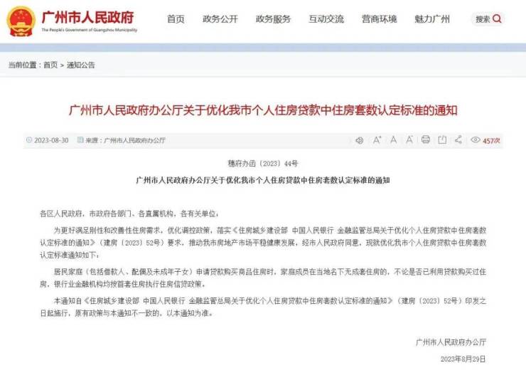 8月30日,广州市人民政府办公厅发布《关于优化我市个人住房贷款中住房套数认定标准的通知》指出: