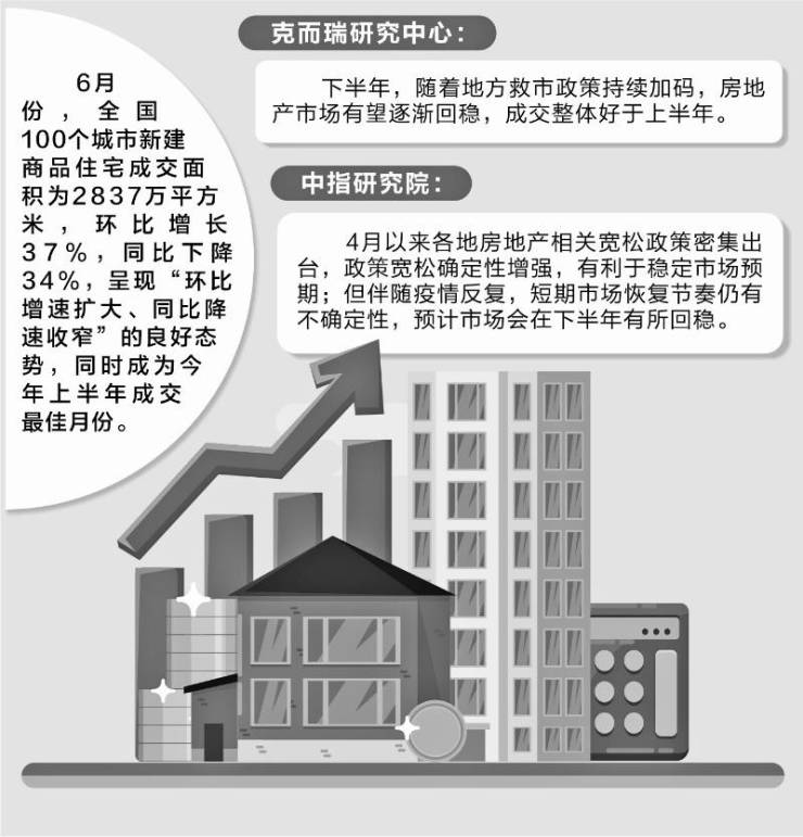 6月,房地产市场呈现出“环比显著增长、同比降幅收窄”的向好态势,百强房企单月销售业绩环比增长六成,上半年累计销售业绩和拿地规模同比降幅仍大,但降幅收窄。不过,业内人士认为,上半年房地产行业仍在深度调整,市场回暖未及预期。预计下半年随着宽松政策持续加码,房地产市场有望逐渐回稳,成交整体好于上半年。