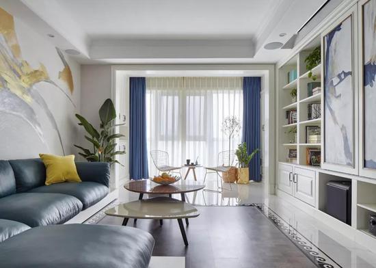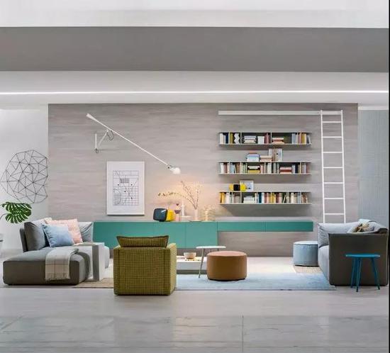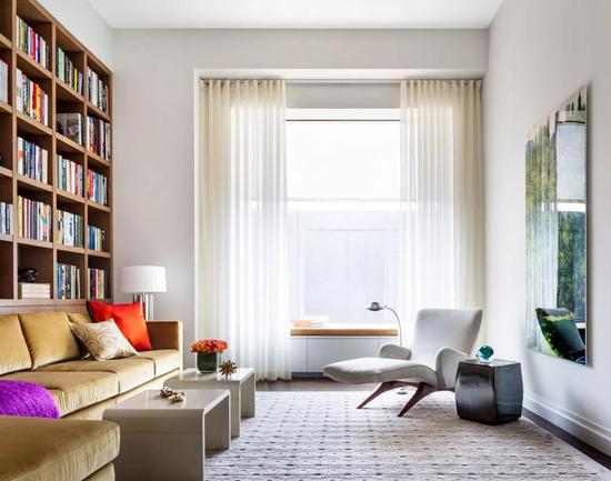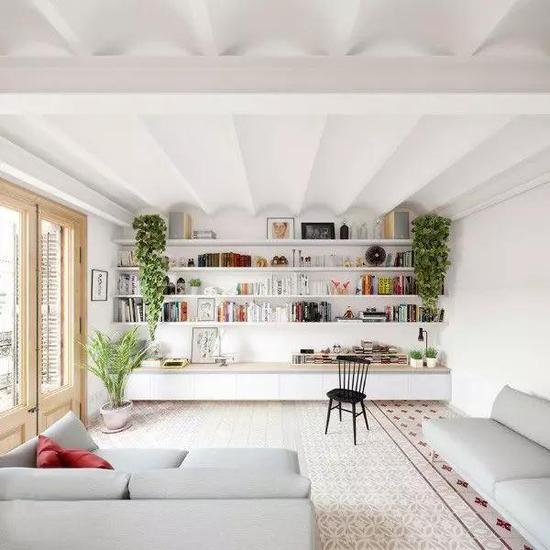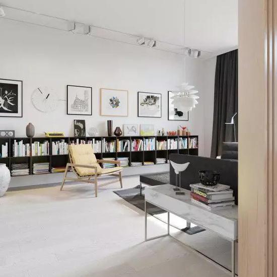 除了装饰画,当下在客厅办公、读书也是一种潮流和趋势,对于不装电视的墙面,我们可以选择装书柜或者书架,满满的书香文艺气息,效果也是相当的优雅大方。