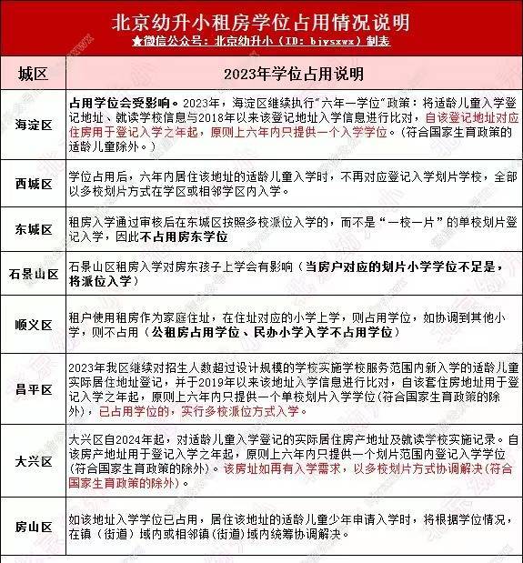 2024年入学家长注意,从往年入学要求来看,东城区租房不占用房东学位,海淀区和石景山区租房对学位是有影响的,顺义区公租房入学占用学位,民办小学入学不占用学位。其他城区暂无官方说明,建议家长联系小招办咨询相关问题!