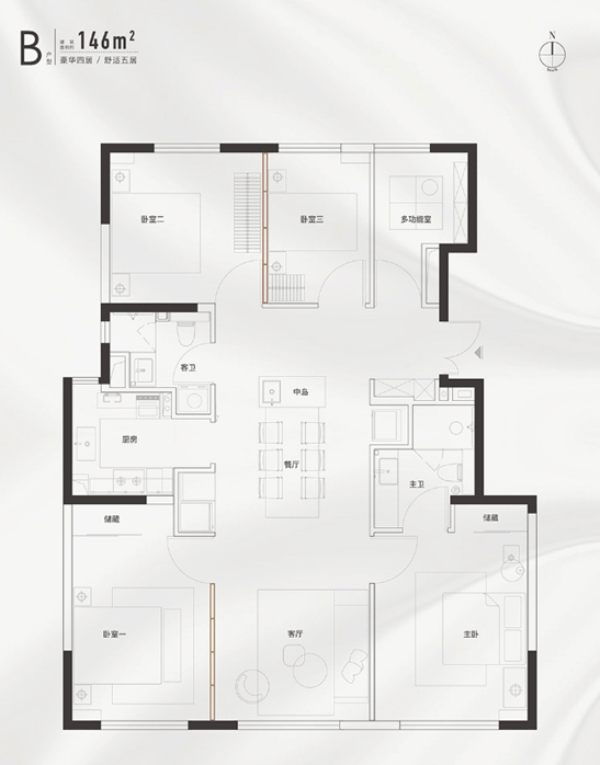 户型方正,可以在三居、四居、五居间自由切换。南向三面宽达10.5米,南北通透。可以变成“7米横厅+主卧套房”的四居组合。,也可以通过移动隔墙变为南向双卧+客厅。