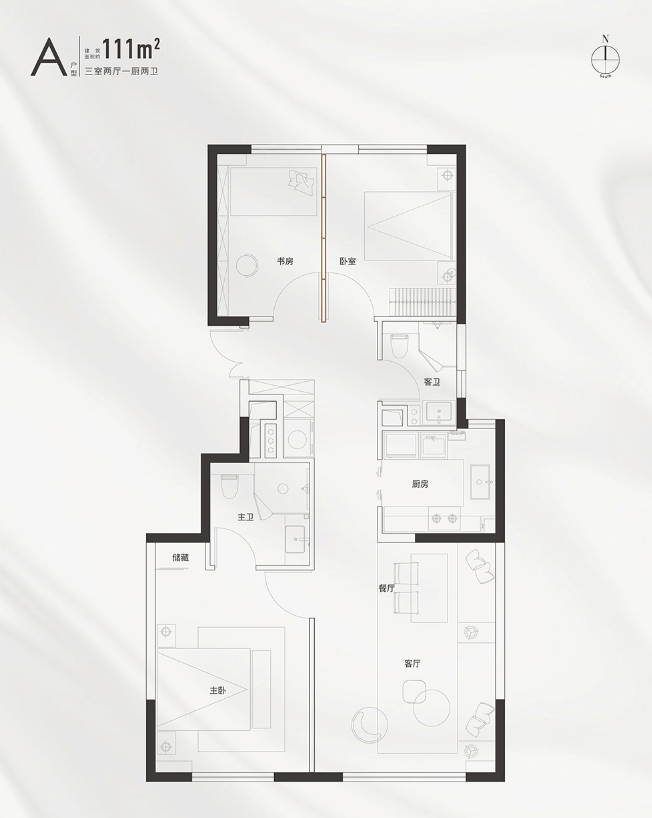 北向空间可以隔断为双次卧+书房,主卧带浴缸,卫浴分离。独立餐厅区,可以放下长餐桌+岛台,餐桌旁还有独立收纳区,U型厨房,双卫生间,功能性非常强的设计。
