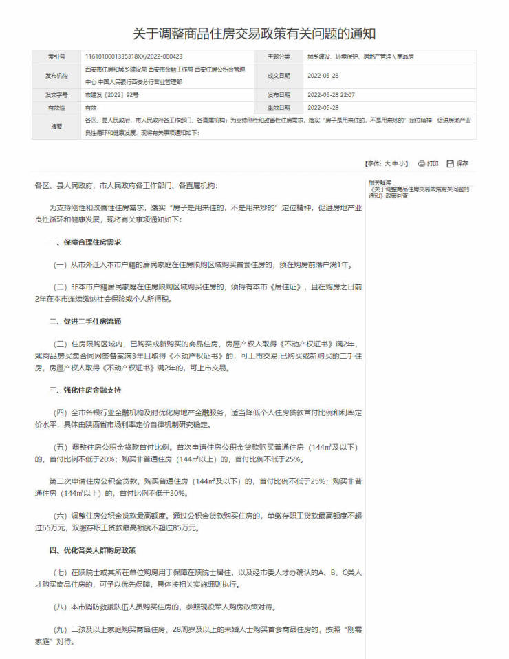 中新财经5月29日电 西安市住房和城乡建设局官方网站于28日晚间公开《关于调整商品住房交易政策有关问题的通知》(下称《通知》),该《通知》由西安市住房和城乡建设局、西安市金融工作局、西安住房公积金管理中心、中国人民银行西安分行营业管理部共同发布,于5月28日当天生效。