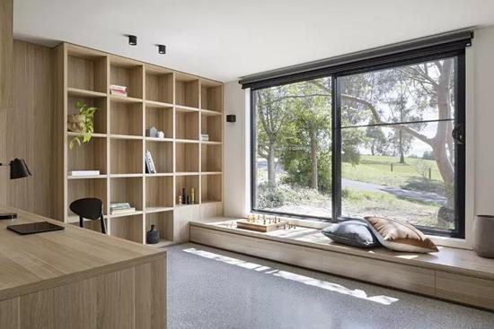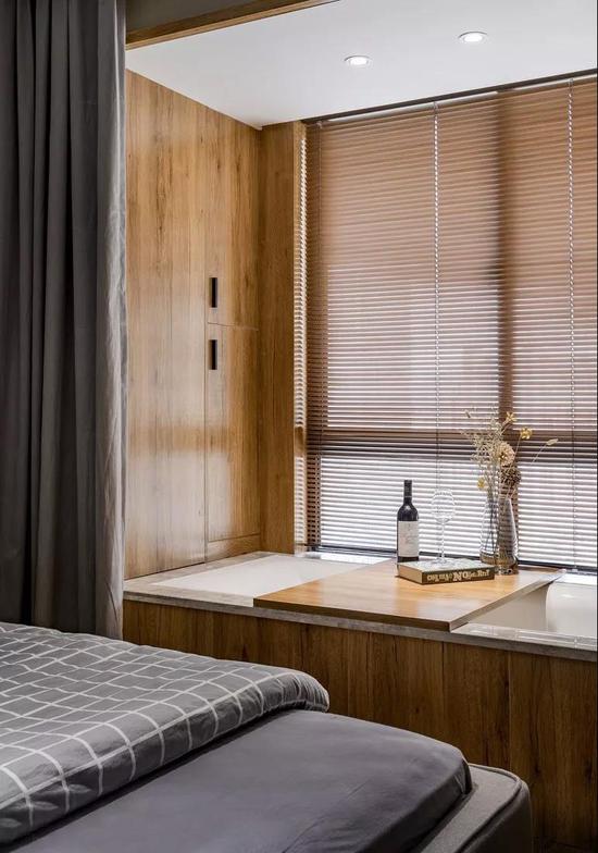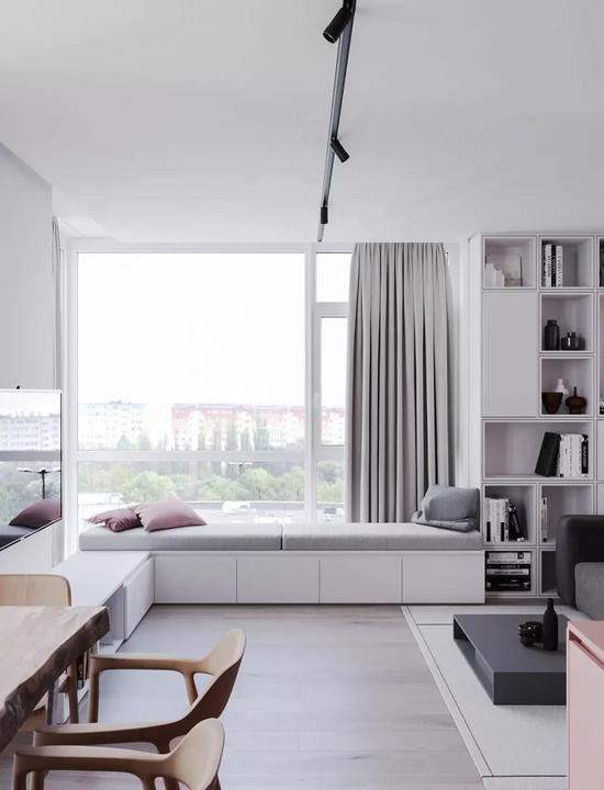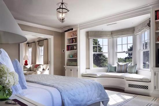 如果飘窗所在的空间比较大,可以将窗帘靠墙,纱窗或者百叶窗靠窗,不仅可以隔出一个独立的窗帘区,也可以让整个空间看起来更大气,整洁。而纱窗或者百叶窗靠着飘窗,不仅仅可以让飘窗上的柜子抱枕等不容易被晒褪色,看起来也更加的美观。