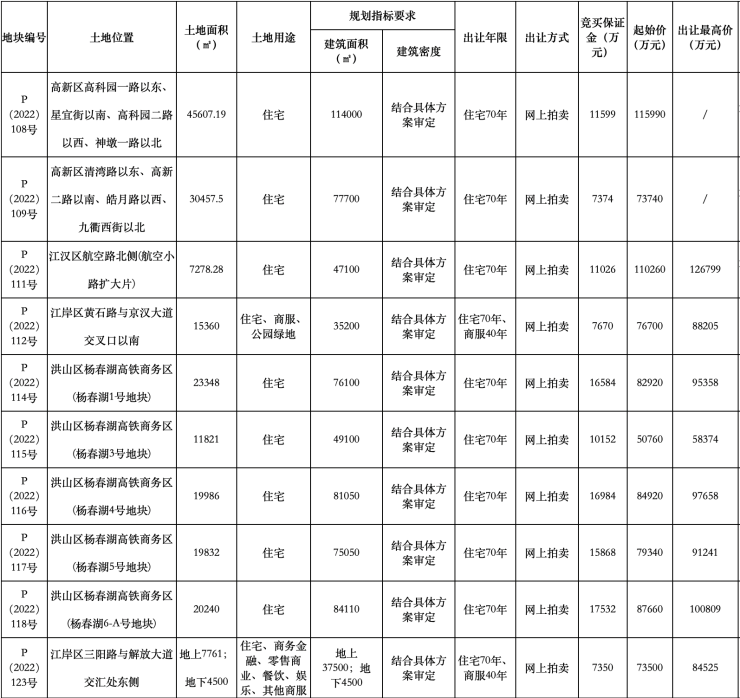 12月7日,武汉市土地交易中心公告,一是将P(2022)108、109、114、115、116、117、118号等7宗地块的拍卖时间调整至12月16日;二是将P(2022)111、112、123号等3宗地块拍卖时间调整至12月20日,以保障相关项目顺利落地。