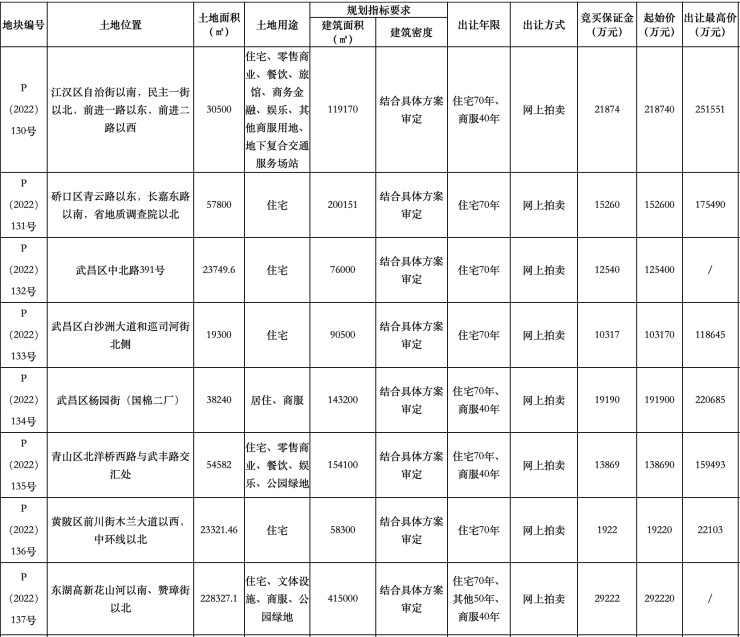 武汉市土地交易中心表示该批次供地一是改善民生,首次推出城市更新项目。本批次公告中P(2022)130号江汉区绍兴片、131号硚口区古四社区等两宗地块,为武汉针对老旧小区改造实施的首批城市更新项目,有利于助力民生工程落地,改善市民的居住环境,进一步提升城市功能和空间品质。