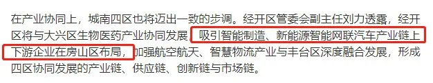 第四轮“城南行动计划”中同样强调积极引进产业项目在房山的布局。