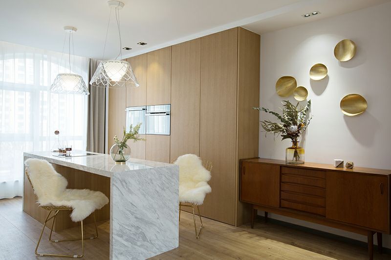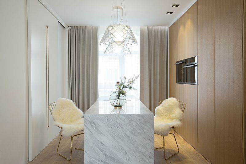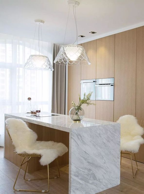 餐厅位于入户的左侧,原木色地板连接客餐厅,入户厅空间视觉效果开阔,素白的墙面与原木质橱柜,整体的大理石岛台,丰富的储物却又平整的台面,整个空间简洁大方,两张羊皮毯自然的搭在金属座椅上,眼前仿佛浮现出清晨阳光洒进房间,餐桌的那杯牛奶里,温暖触手可及。