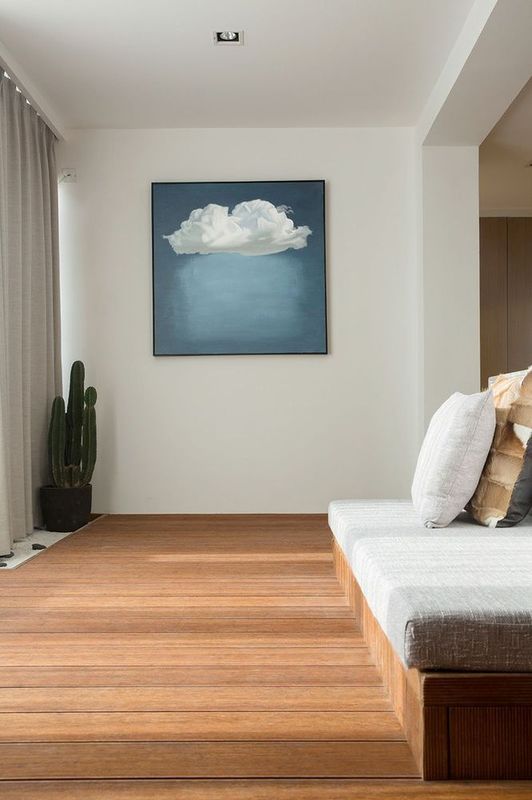 业主是好客之人,因此设计师在客厅的布置上花了一点心思。在休闲的下午,阳光穿过阳台,斑驳的光影映在柜子和地面上,三两好友席地而坐,一位侧躺在躺椅上,将手机放在皮质的茶几上,开始讲述着工作中的趣事儿。阳台外的树尖儿上,停着一只布谷鸟,闹中取静,是那么合乎心意。