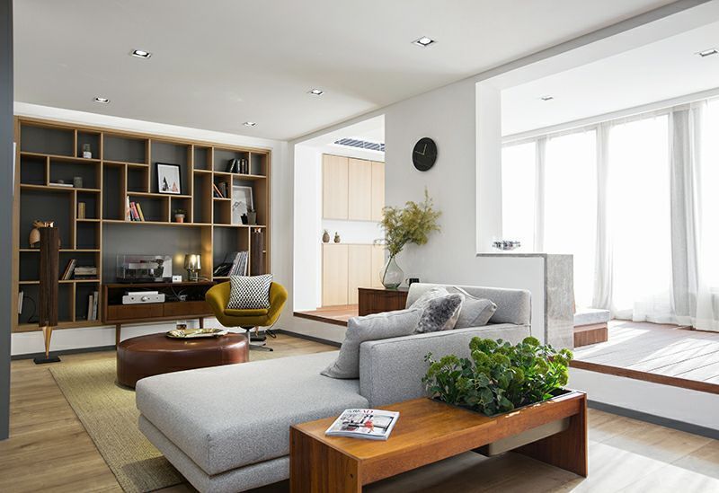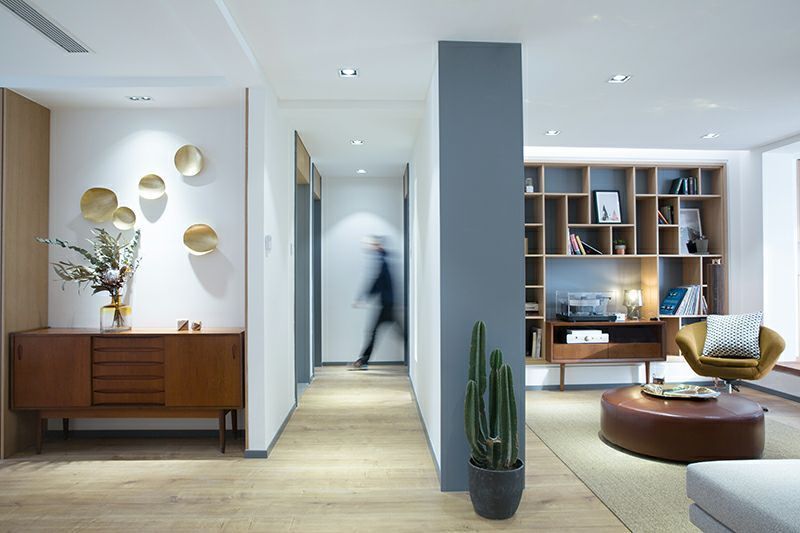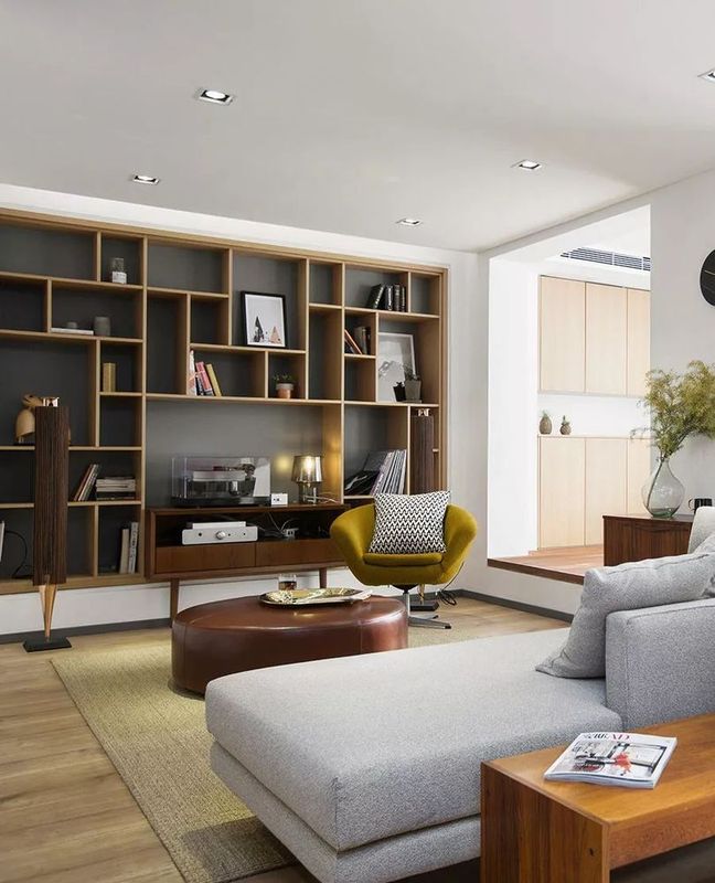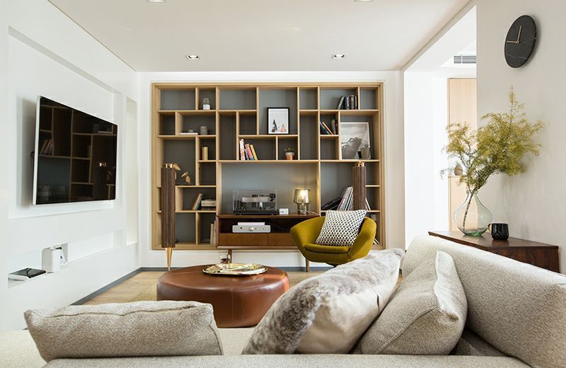 客厅原有空间局促而狭小,采光和通风不是很好。利用充满新意的设计思维和自带故事的装饰摆件,创造出一个弹性空间,通过不同的展现方式和人的不同状态,让这个区域既是客厅,亦是一个娱乐厅、影音厅。
