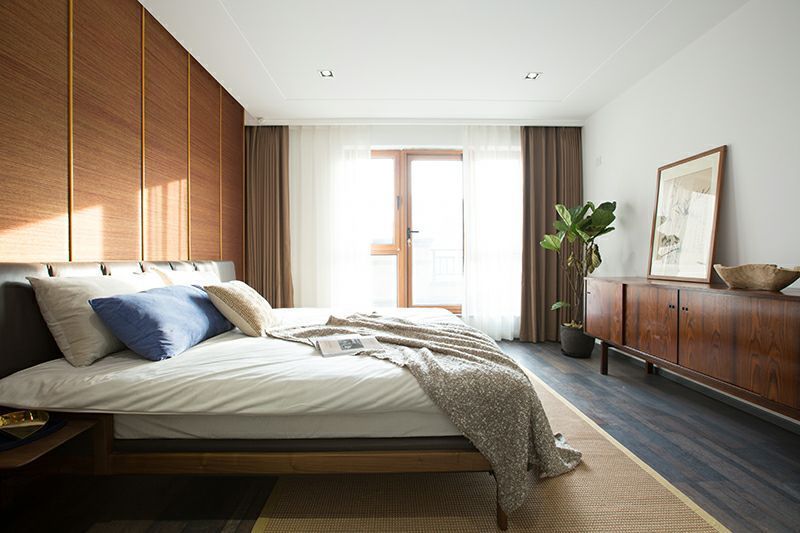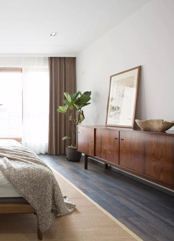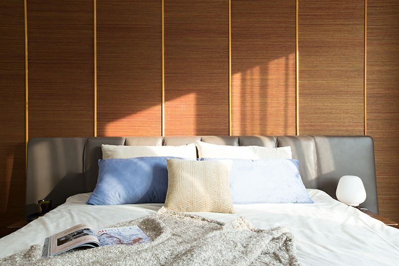 卧室床头背景墙使用竹线全编制壁布,与地上的手工编制亚麻毯相呼应的淳朴质感,在温暖的阳光下营造着优雅的氛围。搭配上软装饰品上琴叶榕的绿,柜子的褐,床品的蓝,亚麻的黄,色彩有张力,又不失沉稳。