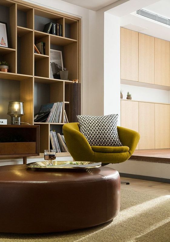 陀螺椅位于客厅旁的休闲区,一抹植物的绿,一本杂志,伴着阳光,原木色的地板与柜门板给人以置身森林的悠闲、慵懒,不自禁的想躺到书房的床榻上,阳光直射于书本,是否需要拉下百叶帘再去倒一杯柠檬水?去度过一个下午的时光。