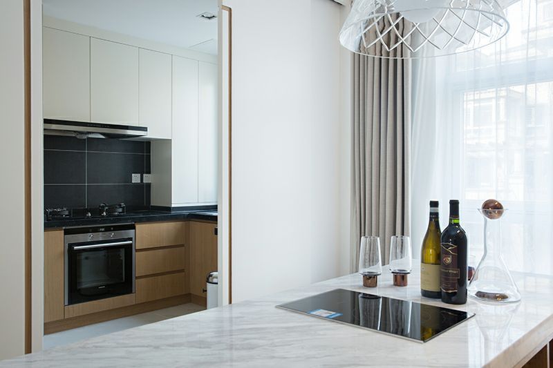 餐厅区域,同样也是多功能于一体,一家人可以在这里用餐和交流情感,也可以搭配一杯醇香的咖啡在这里进行工作,或者拿出一瓶红酒在这里招待朋友。而针对这个区域的设计,更关注的是比例,受到厨房电器的尺寸深度制约,如何让这些电器和储物柜一起融入空间中,使得空间合理利用、环境氛围一致,视觉美观又感觉舒适,这是在设计时更为关注的,也是在施工时和团队反复磨合的。