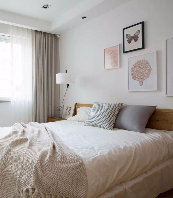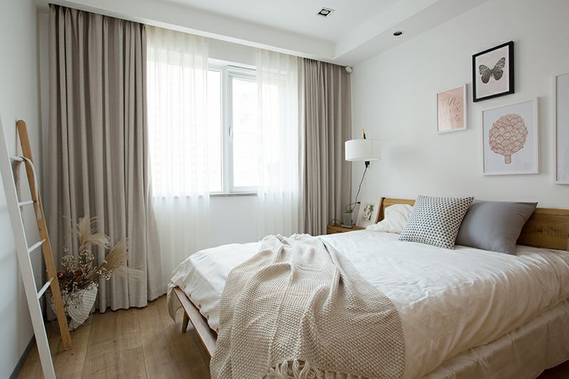 次卧的浅咖色调清新淡雅,秋天采回家随意放在角落的一束干花,墙边倚靠的搭衣杆,朴素温馨的北欧气质显露无疑。