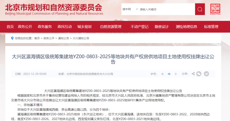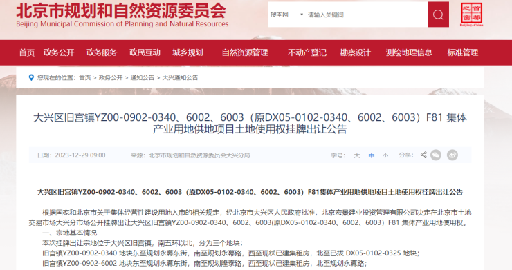 七、本次挂牌出让的详细资料和竞买要求请参阅有关挂牌文件。挂牌公告文件于2023年12月29日起由竞买人在北京市规划和自然资源委员会官方网站自行下载。
