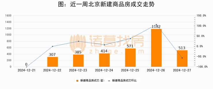 根据北京市住房和城乡建设委员会数据显示,2024年12月27日北京新建商品房成交513套,较昨日减少669套,环比下降56.6%