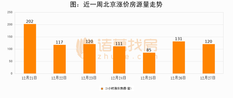 根据诸葛找房数据显示,北京24小时涨价房源量为120套,较12月26日减少11套,环比下降8.4%。与此同时,涨价房源占比小幅回落,对于购房者来说是一个入市窗口期,购房者可抓住时机入市。
