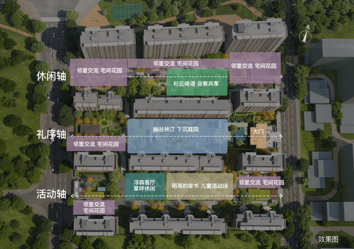 「邻里交流」宅间花园:四季花境为幕,艺术小品点缀,晨练、阅读、茶叙,促进邻里互动。