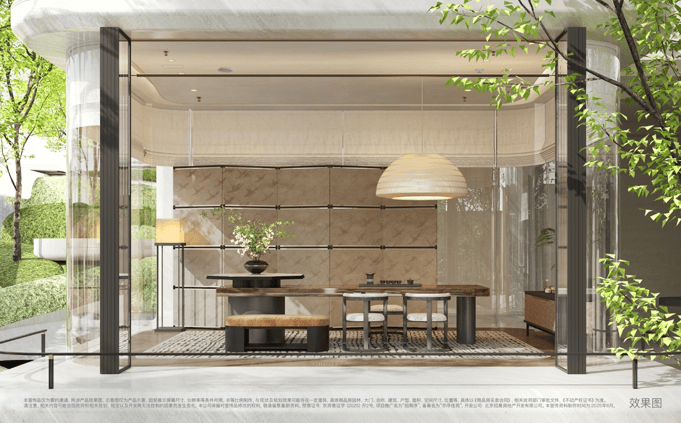 雅致生活馆:金属铜门与全透玻璃营造归家仪式感,下沉会客厅与茶室诠释美学生活;