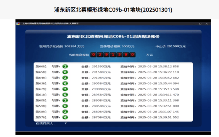 3月28日,上海第三批集中出让的住宅地块进入现场竞价环节。浦东新区北蔡楔形绿地C09b-01地块吸引7位竞买人参与竞拍,经过66轮竞价,触及中止价,两位竞买人选择进入竞高品质指标环节。