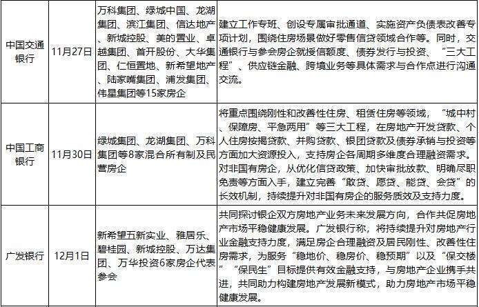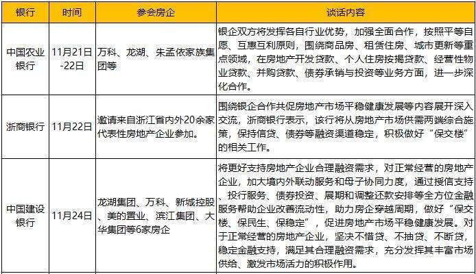 此外,六大行的房企参会名单包括国有企业、混合所有制企业、民营房企,重点参会房企包括万科、龙湖、新城、滨江、美的置业等。