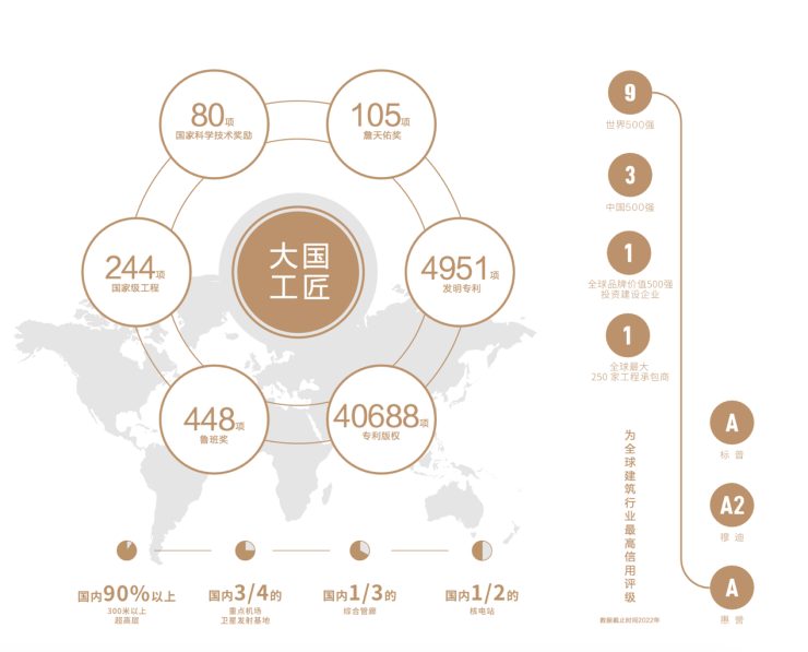 中国建筑,位列2022年《财富》世界500强第9位,中国企业500强第3位,稳居ENR“全球最大250家工程承包商”第1位,代表中国房建领域的最高水平,经营业绩遍布国内及海外一百多个国家和地区。在我国,中国建筑投资建设了90%以上300米以上摩天大楼、3/4重点机场、3/4卫星发射基地、1/3城市综合管廊、1/2核电站,每25个中国人中就有一人使用中国建筑建造的房子。