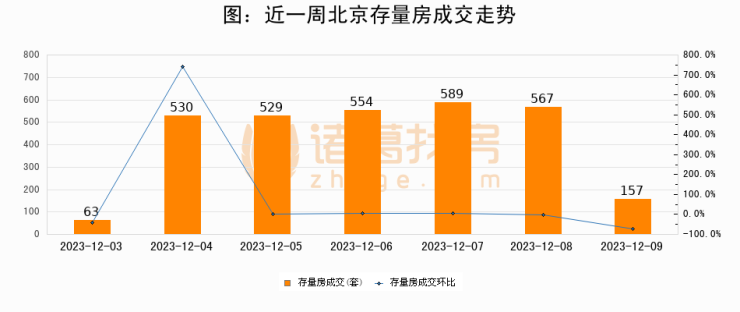 从存量房来看,2023年12月09日北京存量房单日成交157套,比昨日减少410套,环比下降72.3%。从近一周存量房成交来看,北京存量房日均成交套数为427套,12月09日单日成交157套,低于近一周平均水平63.2%。