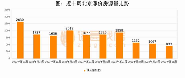 从调价房源来看,第26周北京涨价房源899套,较上周下降15.7%。与此同时,26周涨价房源占比回落0.34个百分点,业主信心小幅波动,购房者可则需入市。