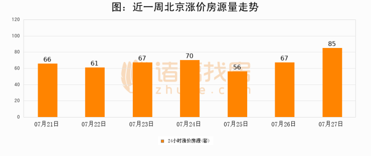 根据诸葛找房数据显示,北京24小时涨价房源量为85套,较07月26日增加18套,环比上涨26.9%。与此同时,涨价房源占比小幅扩大,业主信心有所提升。
