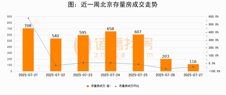 从存量房来看,2025年07月27日北京存量房单日成交116套,比昨日减少87套,环比下降42.9%。从近一周存量房成交来看,北京存量房日均成交套数为489套,07月27日单日成交116套,低于近一周平均水平76.3%。