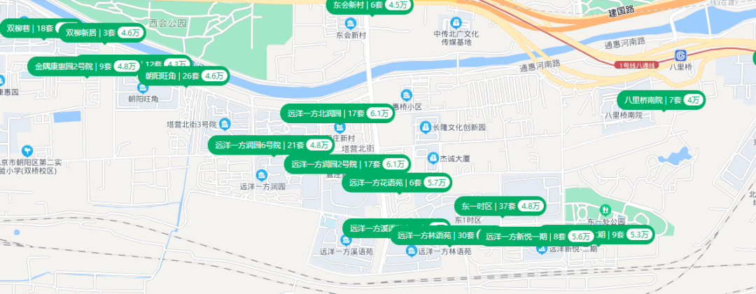 项目处于朝阳与通州的交界地带,根据某绿中介显示,周边二手房均价在4.6万~6.1万之间,房龄较新的也在10年左右了,品质各有不同。