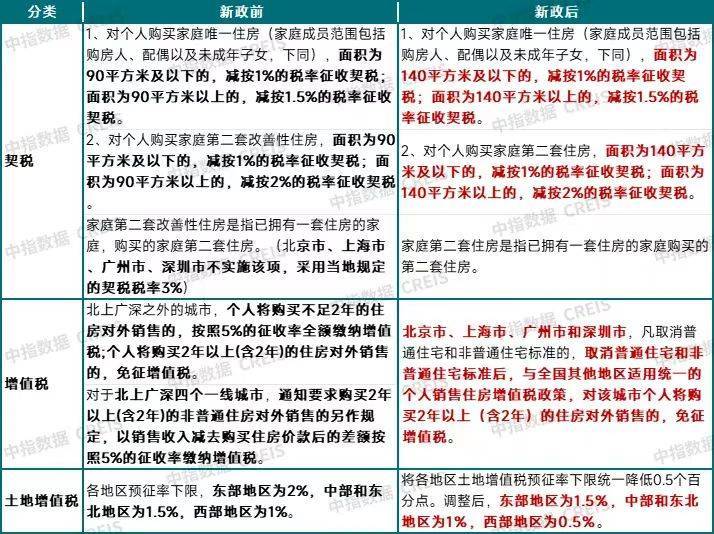 新政:契税方面,将现行享受1%低税率优惠的面积标准由90平方米提高到140平方米,并明确北京、上海、广州、深圳4个城市可以与其他地区统一适用家庭第二套住房契税优惠政策,调整后,在全国范围内,对个人购买家庭唯一住房和家庭第二套住房,只要面积不超过140平方米的,统一按1%的税率缴纳契税。