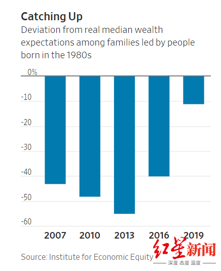 ▲2019年,美国千禧一代比起老一辈的人在同一年龄段的净资产低了11%,而这与2016年40%的差距相比有了较大的改善。