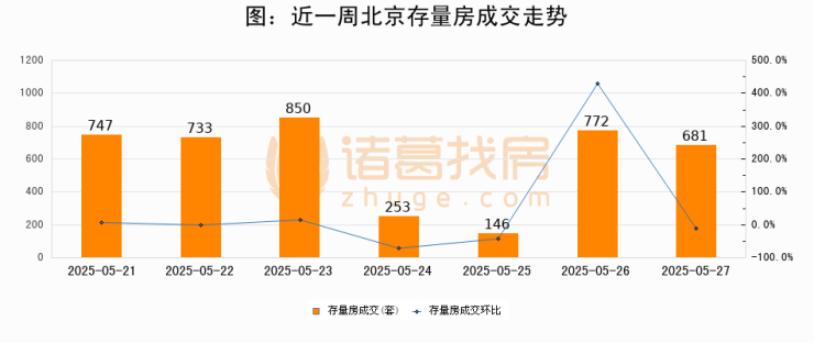 从存量房来看,2025年05月27日北京存量房单日成交681套,比昨日减少91套,环比下降11.8%。从近一周存量房成交来看,北京存量房日均成交套数为597套,05月27日单日成交681套,高于近一周平均水平14.1%。