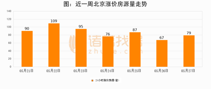 根据诸葛找房数据显示,北京24小时涨价房源量为79套,较05月26日增加12套,环比上涨17.9%。与此同时,涨价房源占比小幅扩大,业主信心有所提升。