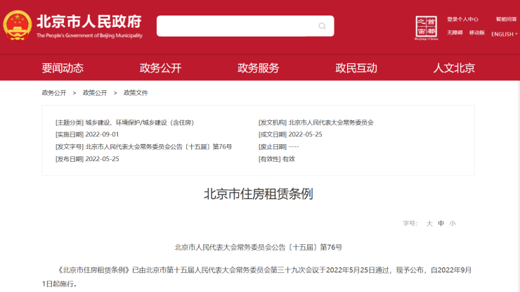 5月25日,《北京市住房租赁条例》(以下简称《条例》)由北京市第十五届人民代表大会常务委员会第三十九次会议正式通过,自2022年9月1日起施行。《条例》对平衡租赁双方权利义务关系、发挥住房租赁管理服务平台的作用、整治“二房东”问题、租金调控等均做了相应规定。