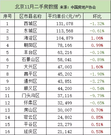11月二手房均价,城六区中仅海淀、朝阳均价环比有小幅度上扬,西城、东城、丰台、石景山均出现不同程度下跌,西城区跌幅较大。