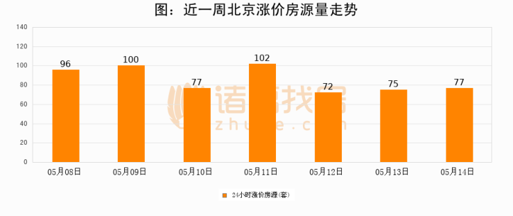 根据诸葛找房数据显示,北京24小时涨价房源量为77套,较05月13日增加2套,环比上涨2.7%。与此同时,涨价房源占比小幅扩大,业主信心有所提升。