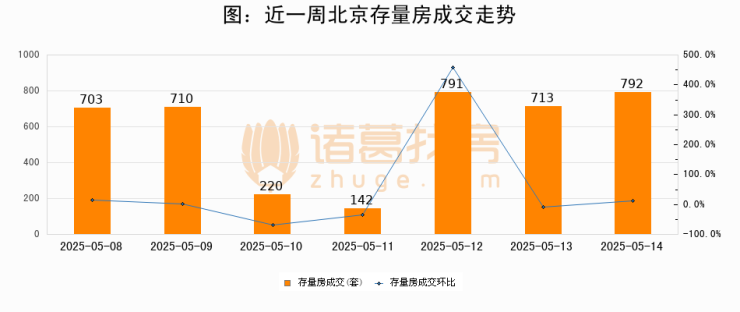 从存量房来看,2025年05月14日北京存量房单日成交792套,比昨日增加79套,环比上涨11.1%。从近一周存量房成交来看,北京存量房日均成交套数为581套,05月14日单日成交792套,高于近一周平均水平36.3%。