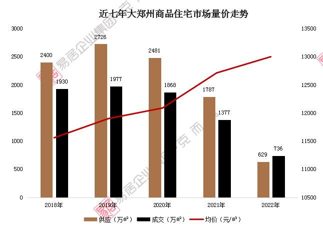下降的不仅是房价,还有销量。据克尔瑞河南区域数据显示,郑州楼市供求规模自2019年以来连续4年下滑,2022年跌破千万平方米,全市全年成交量736万平方米,同比2021年1377万平方米的成交量几近腰斩。