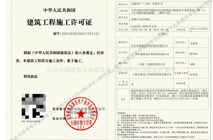 从施工许可信息看,工程名称为天津高新区软件和服务外包基地综合配套区中央商务区一期(117办公楼及商业裙楼)(剩余工程),建设单位为高银地产(天津)有限公司,施工时间为2025年4月30日至2027年4月30日,合同价格为56874.813万元,总面积为418020平方米。