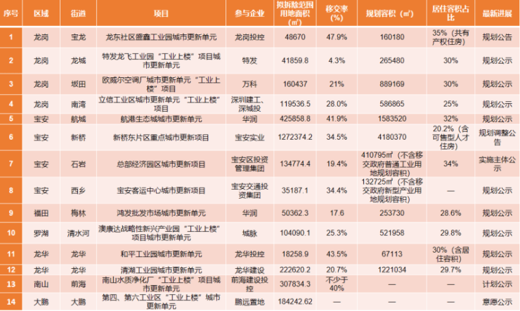 来自合一城市更新研究院的统计显示,截至10月份,深圳共有14个城市更新类“工业上楼”项目有了新进展,拟拆除重建范围面积超312.6公顷,总计容建筑面积超1027万平方米。
